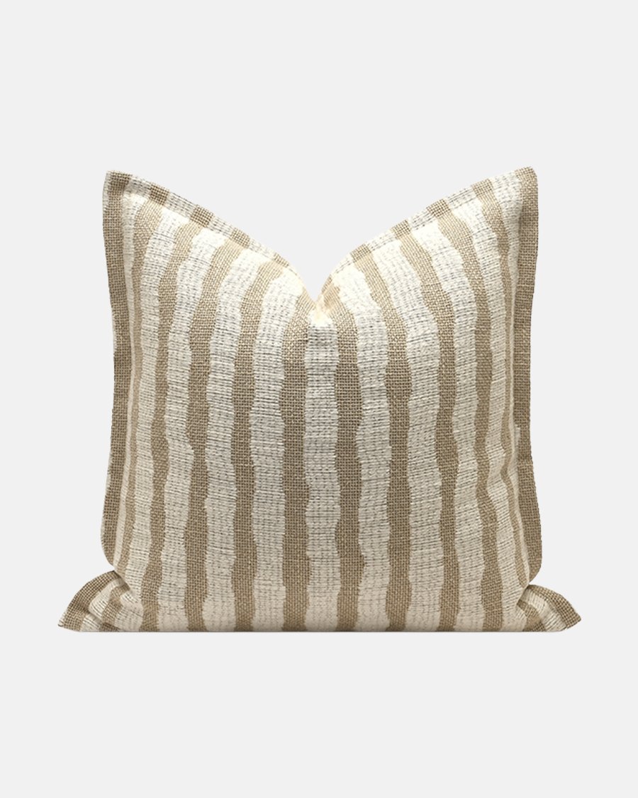 • Features unique, vertical, irregular wavy cream-colored stripes on a natural tan background.