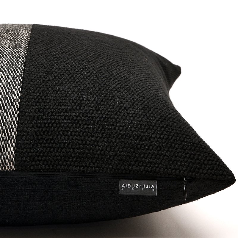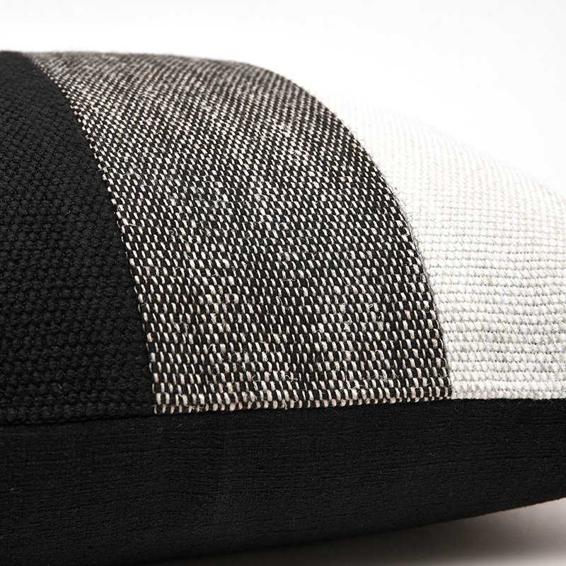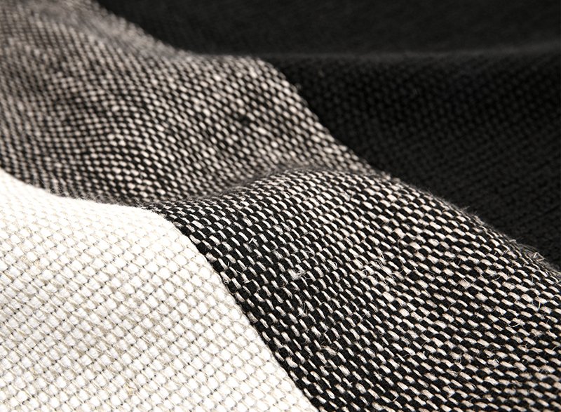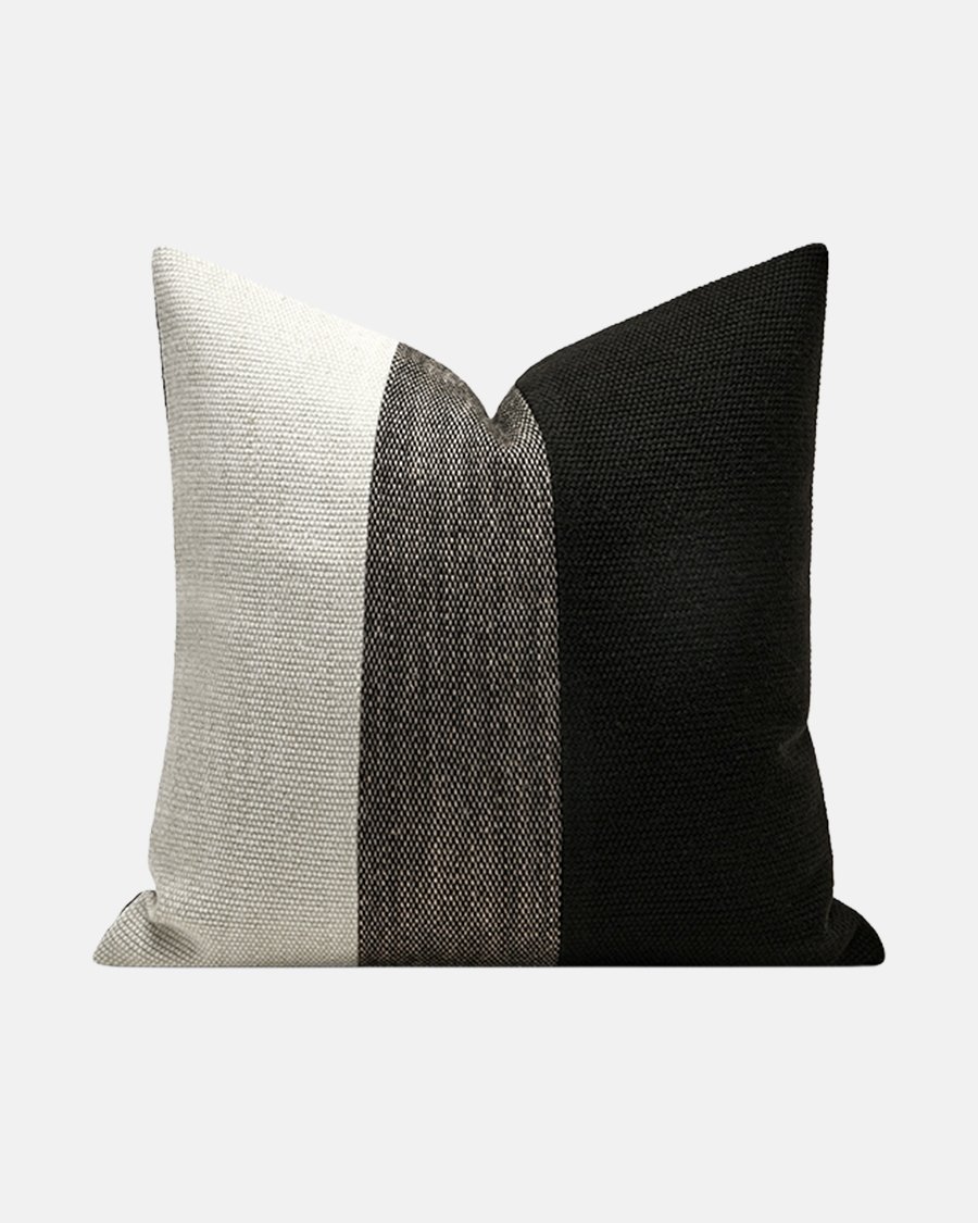 - Striking vertical blocks of off-white, heather grey, and matte black.