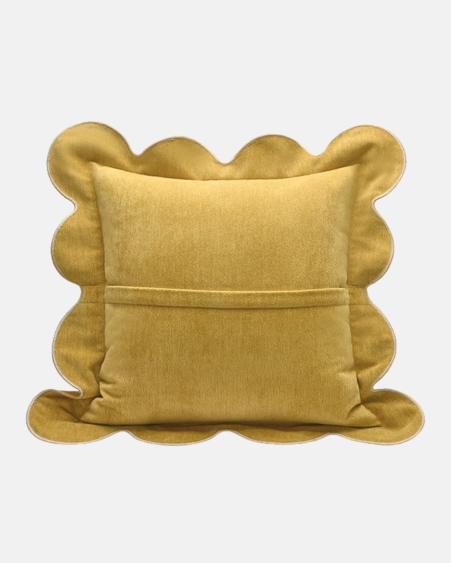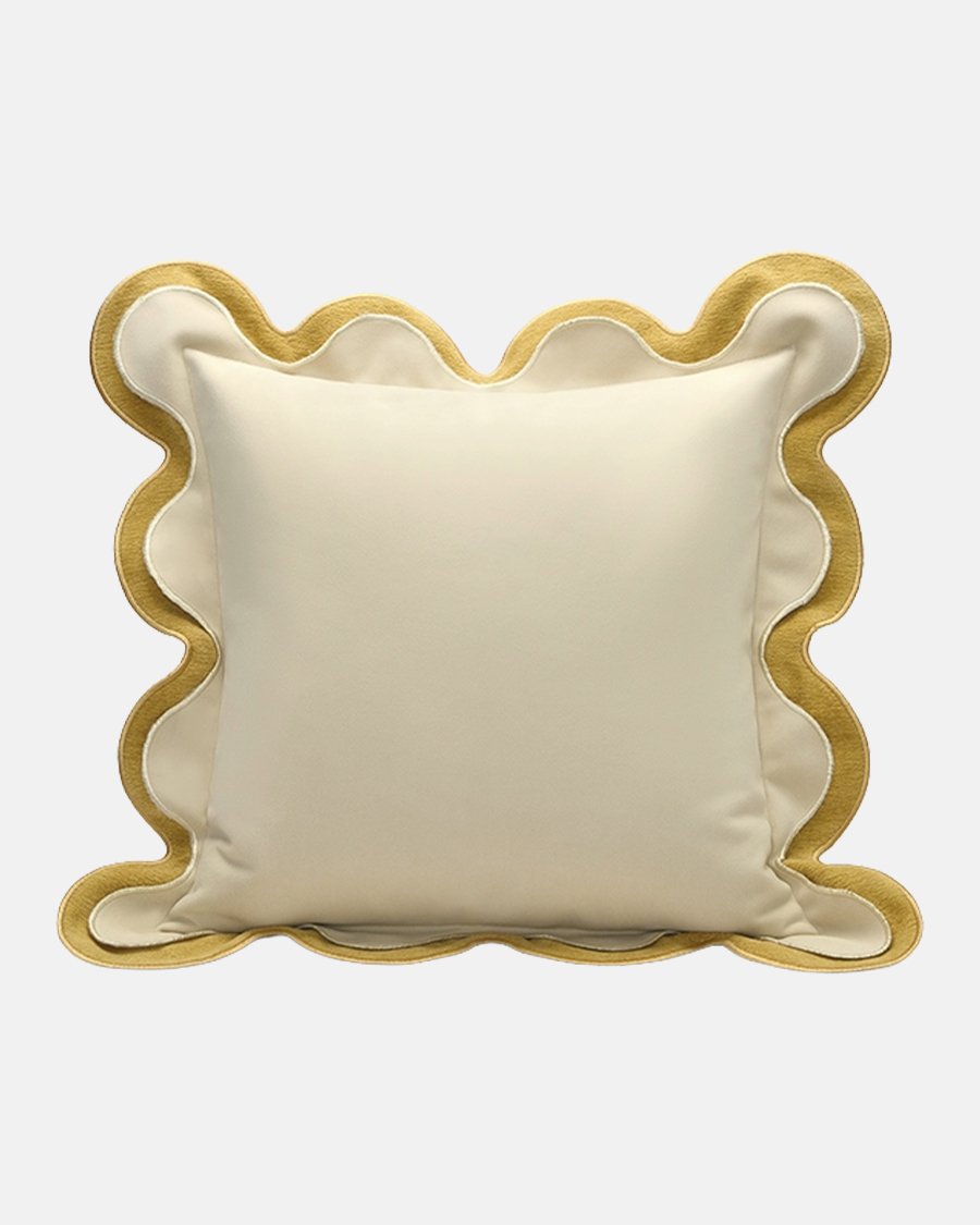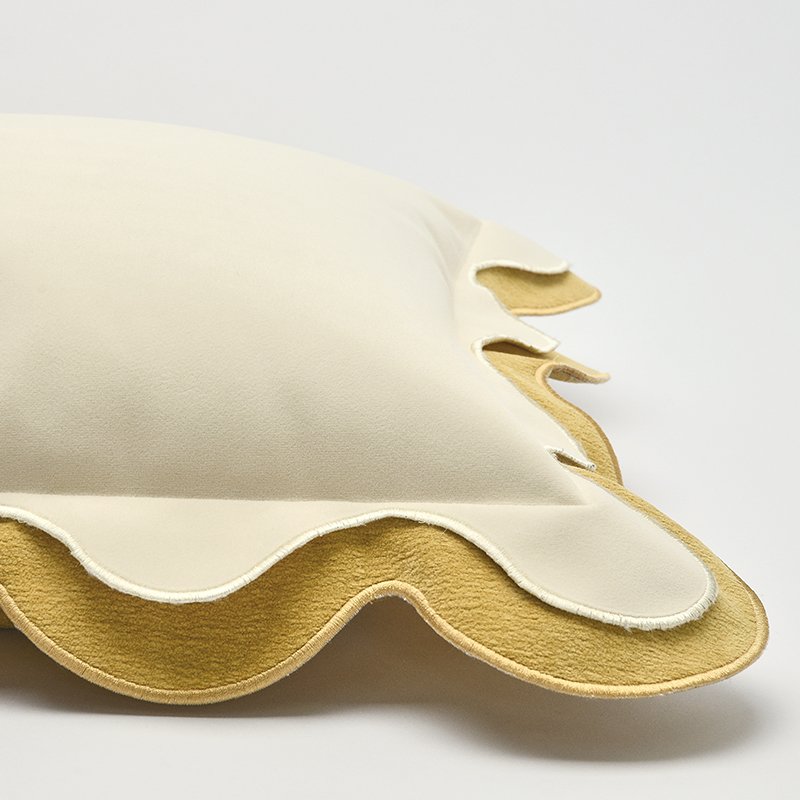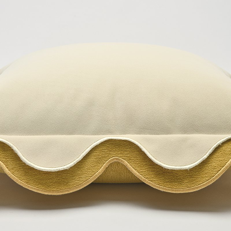 - A unique double-layered scalloped edge design in cream and mustard gold, mimicking the shape of a biscuit.